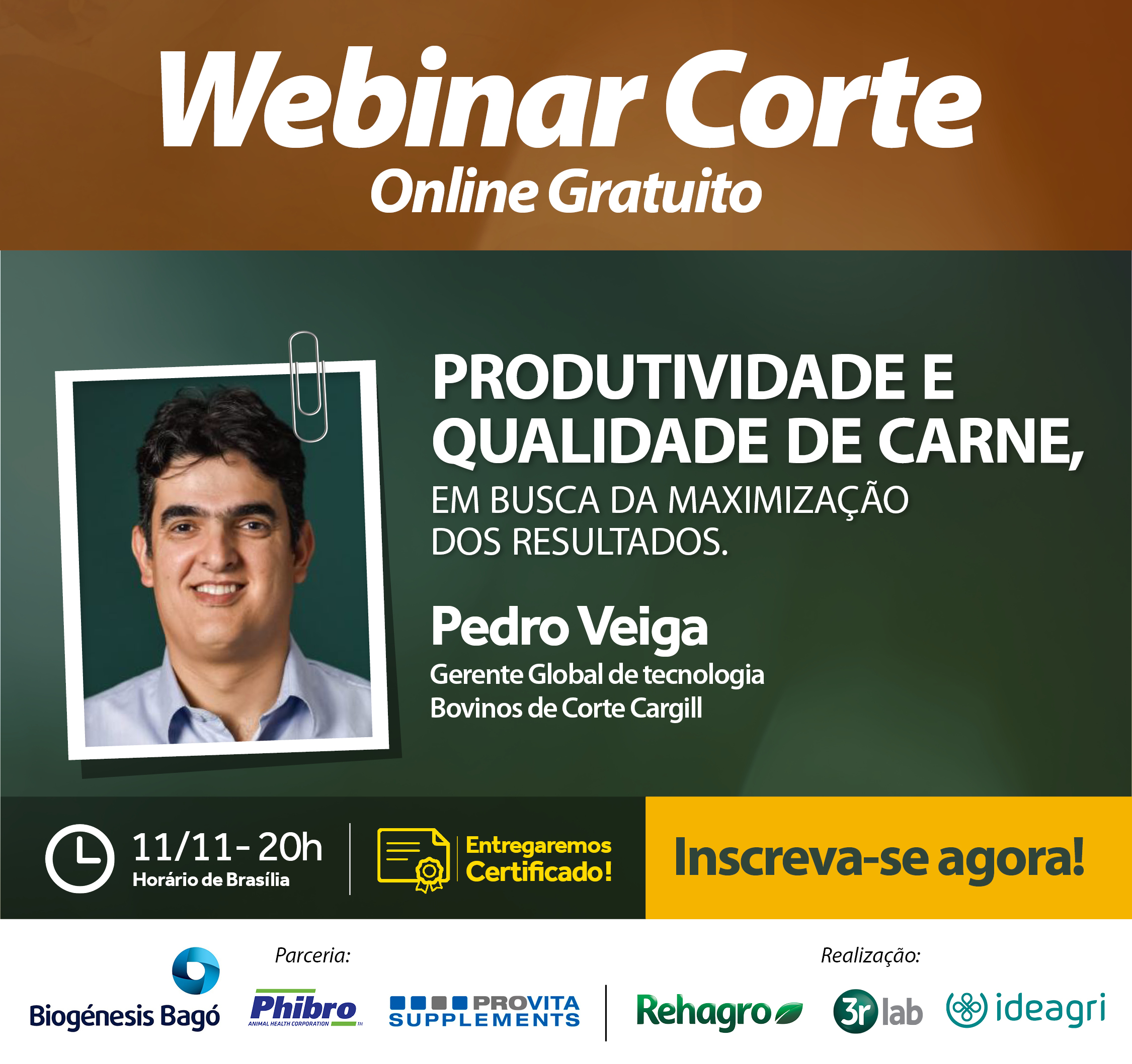 Em 2019, fizemos a transmissão de um Webinar Corte sobre produtividade e qualidade de carne, em busca da maximização dos resultados. O palestrante foi Pedro Veiga, Gerente Global de tecnologia Bovinos de Corte Cargill.