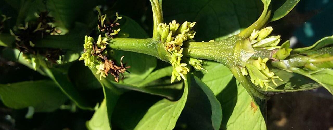 Desuniformidade na maturação – Presença de flores e frutos na mesma planta. (Foto: Larissa Cocato).